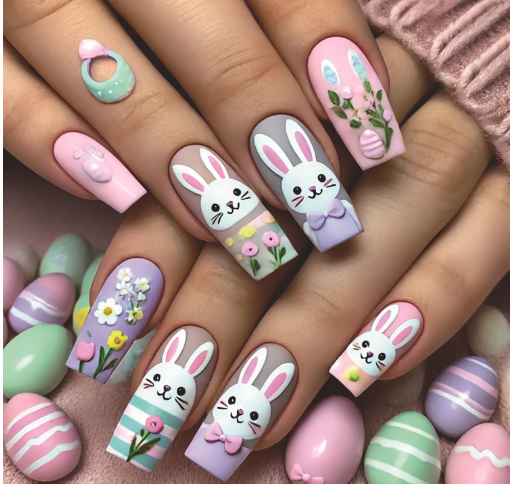 Bunny Press on Nails Long Square Fake Nails Cute Glue on Nails Flower Rabbit False Nails Easter Press on Nails Reusable Stick on Nails Full Cover Artificial Nails Long Acrylic Nails for Women 24Pcs