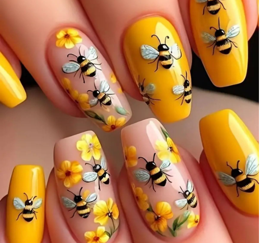 24 Pcs Yellow Press on Nails Medium Square 3D Relief Bumblebee Design - ZIFANHU Spring Acrylic Nail Art Kit Fake Nails Press ons Nail Tips Full Cover Cute...