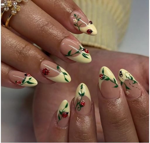 Yellow French Tip Press on Nails Almond Fake Nails with Ladybug Green Leaves Design Short False Nail Press ons Reusable Artificial Nail Full Cover
